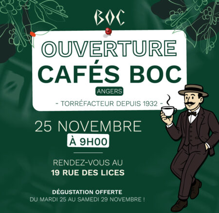 Les Cafés BOC ouvrent leur première franchise le 25 novembre, au 19 rue des Lices à Angers ! C’est une nouvelle étape dans notre projet : contribuer à préserver la filière en accompagnant l’installation de torréfacteurs de proximité.